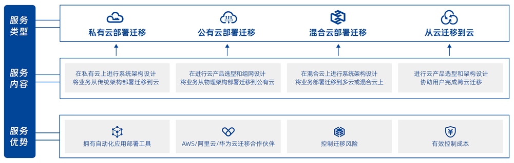 提供业务上云及云间迁移的端到端服务,评估业务系统现状,规划设计迁移架构、迁移技术和迁移方案,应用及数据上云迁移实施,云上系统部署,云上数据及业务验证,迁移后运维保障及持续优化服务。